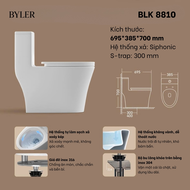 Bồn cầu Byler BLK 8810 sở hữu nhiều ưu điểm nổi bật, đáp ứng tốt nhu cầu sử dụng hiện đại. Thiết kế 1 khối giúp tăng tính thẩm mỹ và dễ vệ sinh, lớp men nano giúp bề mặt luôn sáng bóng và sạch sẽ. Hệ thống xả xoáy mạnh mẽ đảm bảo hiệu quả làm sạch, trong khi nắp ngồi PP và phụ kiện inox cao cấp giúp tăng độ bền và tuổi thọ sản phẩm, mang lại sự an tâm cho người sử dụng.