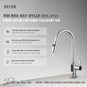 Vòi rửa bát Byler BVC 8701 không chỉ đáp ứng nhu cầu sử dụng cơ bản mà còn mang đến trải nghiệm thông minh, an toàn và tiết kiệm. Với thiết kế hiện đại, công nghệ LED độc đáo và khả năng vận hành linh hoạt, sản phẩm là lựa chọn lý tưởng cho những ai muốn nâng cấp không gian bếp một cách thực sự khác biệt.