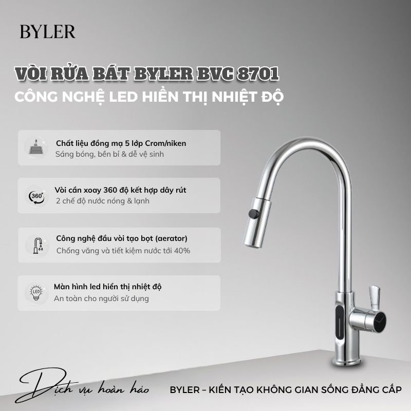 Trong căn bếp hiện đại, sự tiện nghi không chỉ đến từ thiết kế mà còn nằm ở công nghệ tích hợp trong từng thiết bị. Một chiếc vòi nước thông minh không chỉ giúp bạn rửa bát mà còn mang lại sự an toàn, chủ động và trải nghiệm hoàn toàn khác biệt. Vòi rửa bát Byler BVC 8701 chính là minh chứng rõ ràng cho xu hướng đó khi kết hợp hoàn hảo giữa thiết kế, tính năng và công nghệ LED hiển thị nhiệt độ độc đáo.