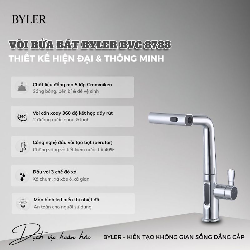 Vòi chậu rửa bát nóng lạnh BYLER BVC 8788 là sự kết hợp hoàn hảo giữa thiết kế hiện đại, chất liệu bền bỉ và công nghệ thông minh. Tính năng dây rút linh hoạt, ba chế độ xả nước cùng màn hình LED hiển thị nhiệt độ giúp sản phẩm mang lại trải nghiệm sử dụng tiện lợi và an toàn hơn. Nếu bạn đang tìm kiếm một vòi rửa bát cao cấp, đa năng và tiết kiệm nước, BYLER BVC 8788 chắc chắn là lựa chọn đáng cân nhắc cho căn bếp hiện đại.
